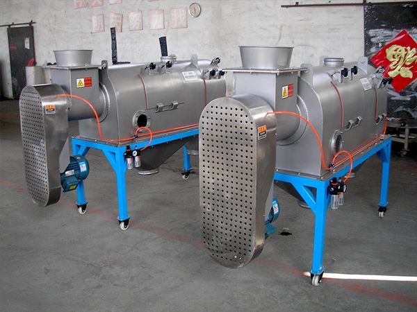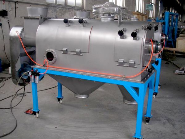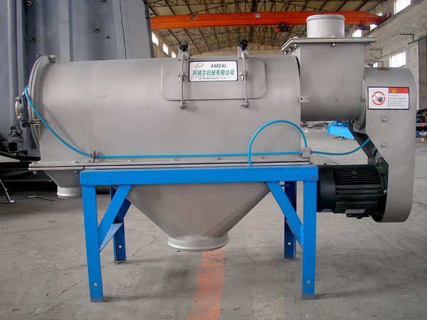 物料由螺旋輸送進入圓桶狀篩網(wǎng)內,由旋轉的葉片使物料分散成霧狀,在旋轉前進中細料受到離心力和推進力作用通過篩網(wǎng),由細料排出口排出,不能過網(wǎng)的物料逐步推進到篩網(wǎng)端部的粗料排出口排出。